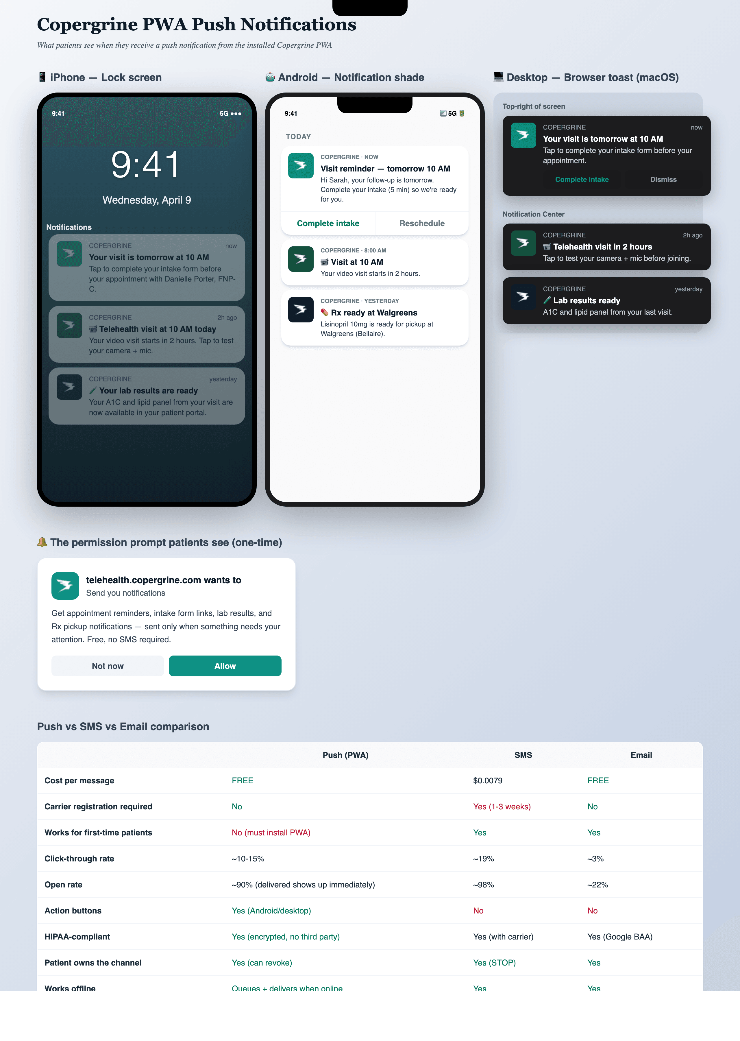 When patients install the Copergrine PWA, they get HIPAA-compliant push notifications on every device — free, no SMS, no third party.