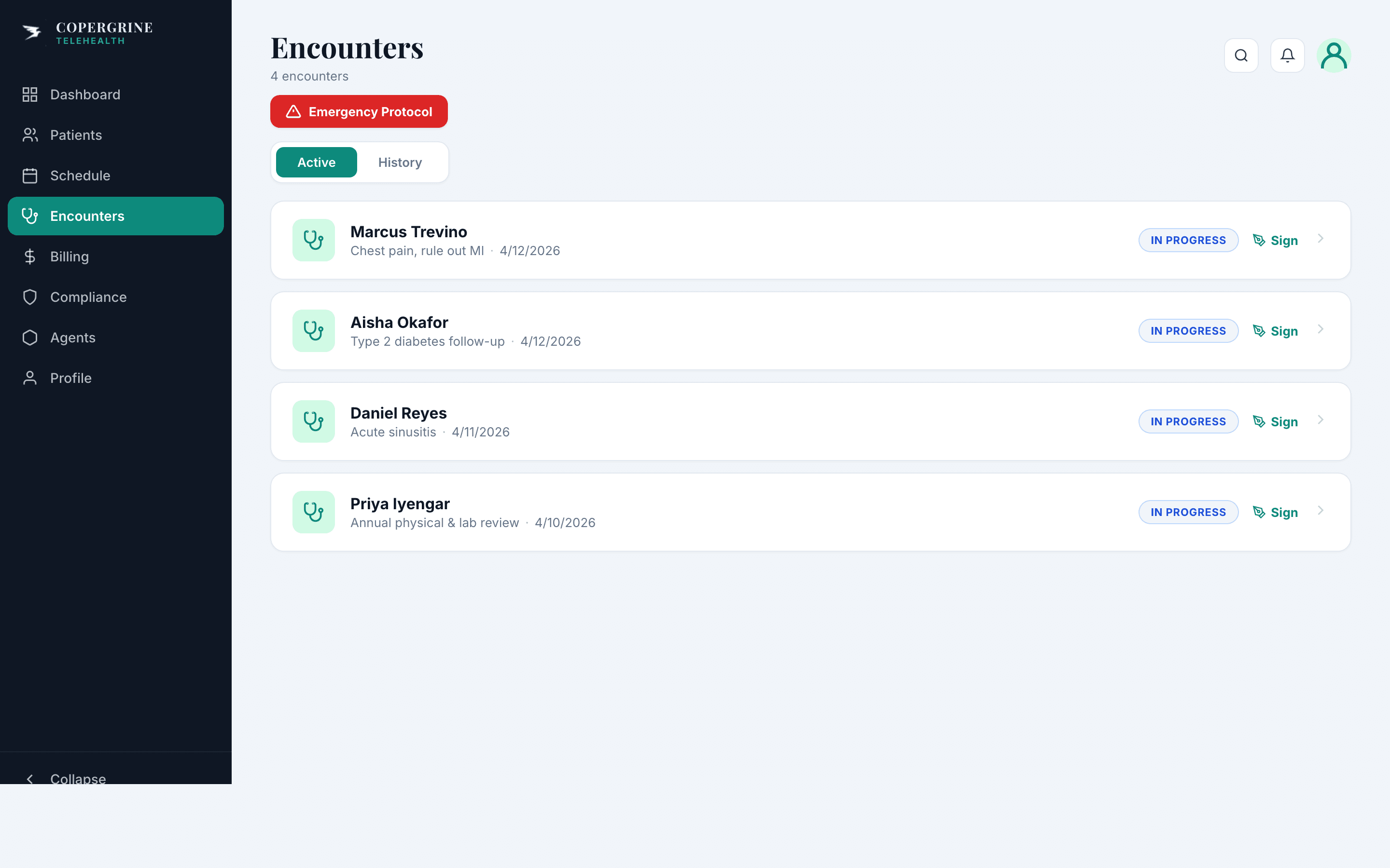Copergrine Telehealth is two things in one platform: a secure way for Houston patients to see a clinician from home, and a complete EMR our providers use to deliver care end to end. Patients book the same way they book an in-person visit. Providers use a single workspace for charting, prescribing, billing, and follow-up.